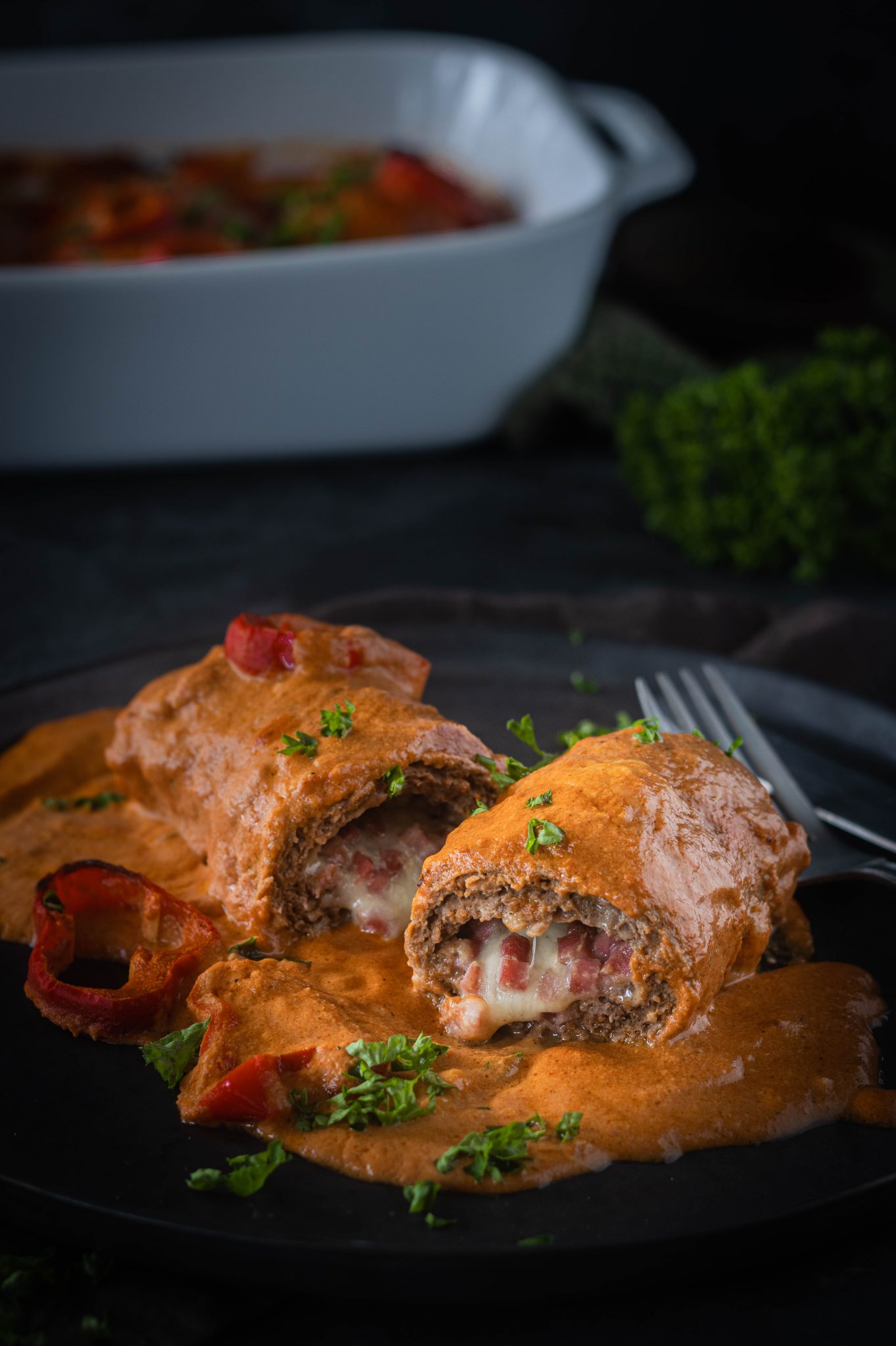 Hackfleisch, Bacon, Käse, ein paar Gewürze und Paprika werden zusammengerollt und baden dann in einer herrlich cremigen Sauce.