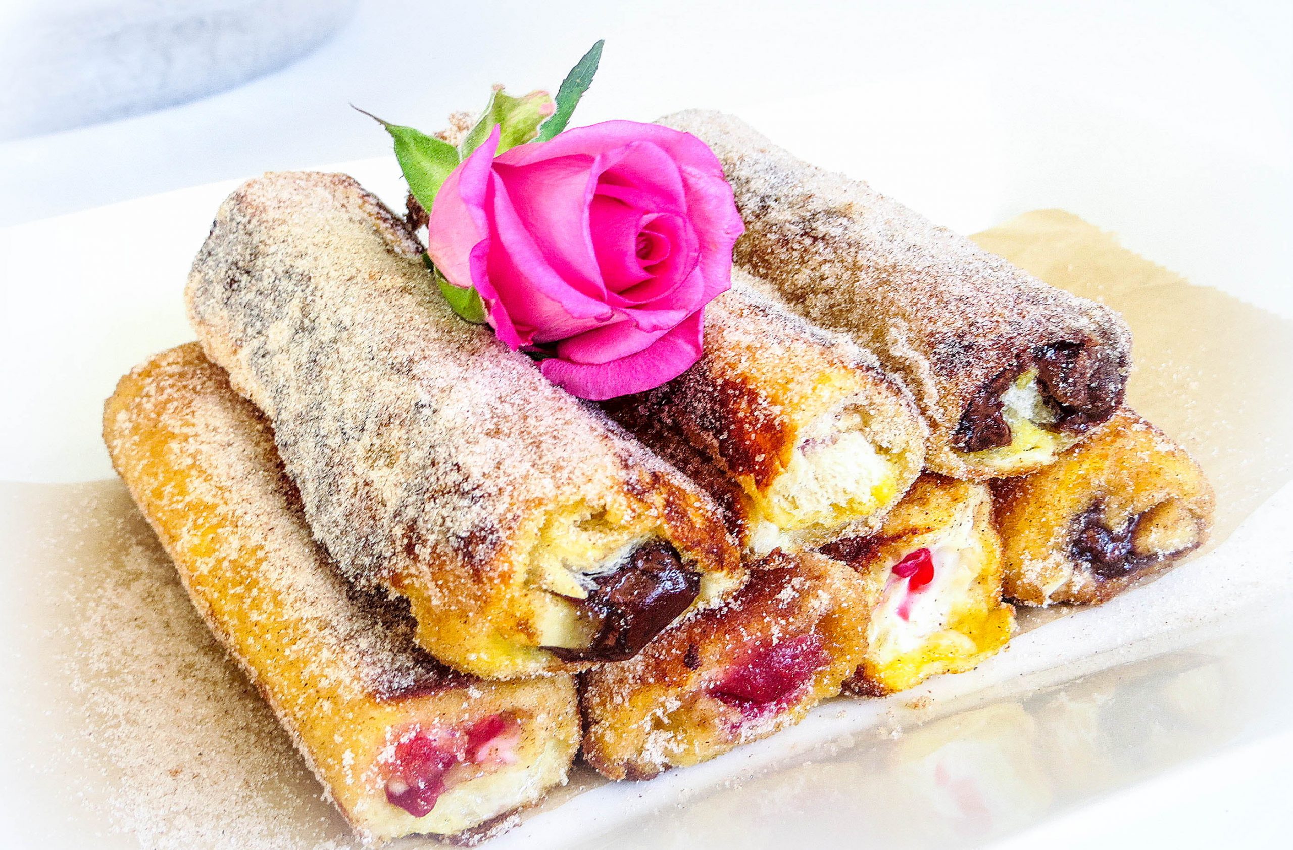 Hier ist es eine aufgerollte Variante, die in einer Hülle aus Zimt und Zucker ausgebacken wird.