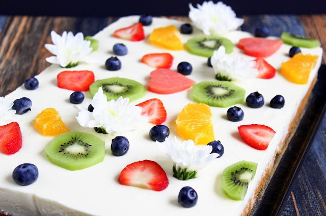 Am allerliebsten essen wir Obst pur. Doch wenn am Nachmittag Kuchen gewünscht wird, kommen sie gerne in Verbindung mit Kuchenteig auf den Tisch. Wir dachten uns, Erdbeeren, Kiwi, Blaubeeren, Orange und Wassermelone passen wunderbar zu einer fruchtigen und zitronigen Creme. Das Blech war so schnell leer geputzt, wir hatten also Recht.