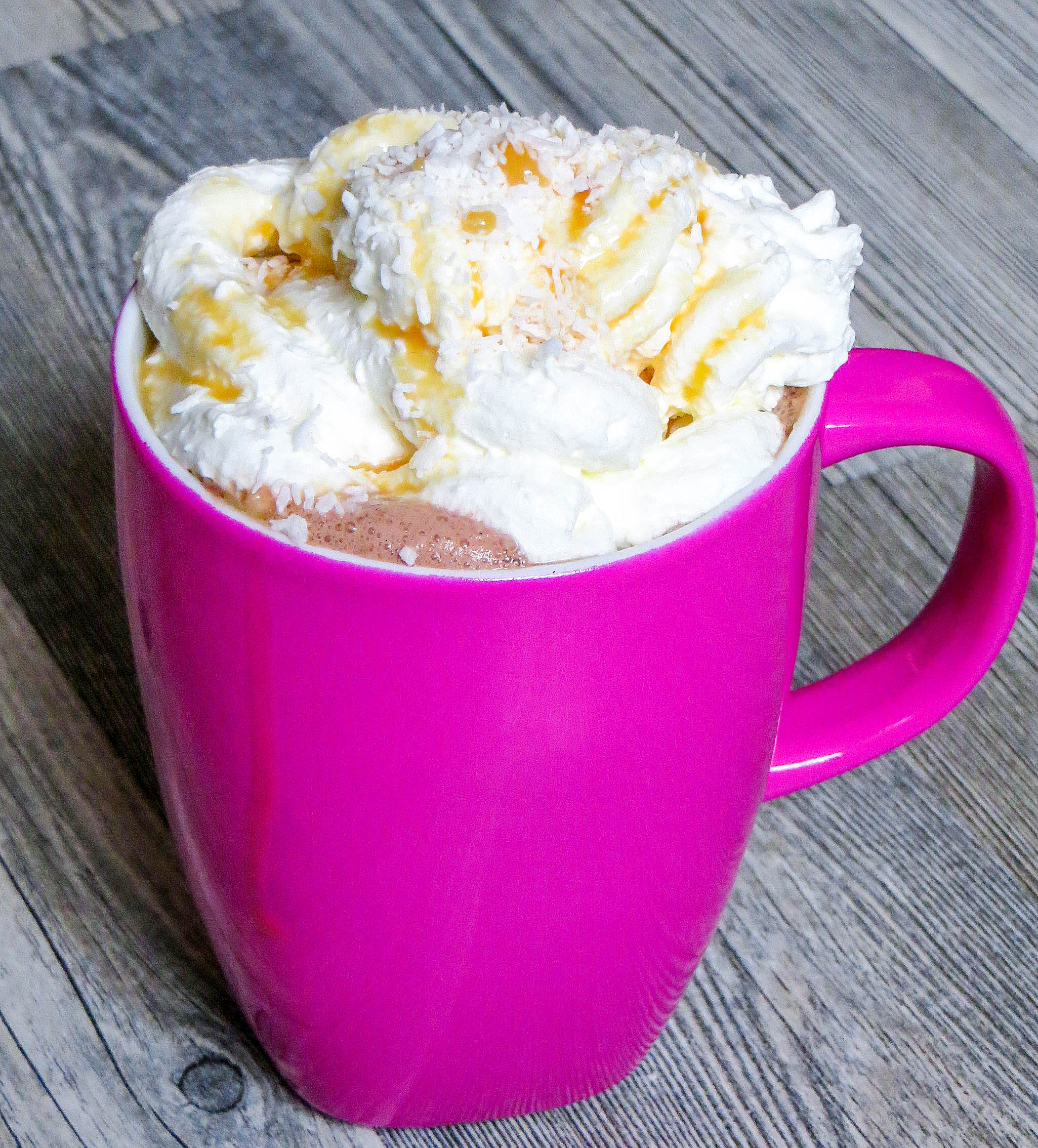 Heiße Schokolade in eine große Tasse füllen und nach Beliben mit Sahne und Kokosraspel garniert servieren.