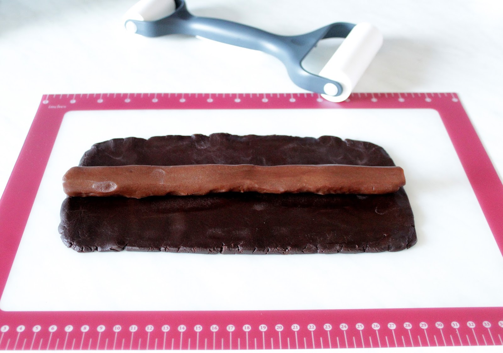 Hellbraunen Teig zu einer Wurst rollen und darauf legen und einrollen. In Frischhaltefolie geben und nochmal 15 Minuten kühlen.