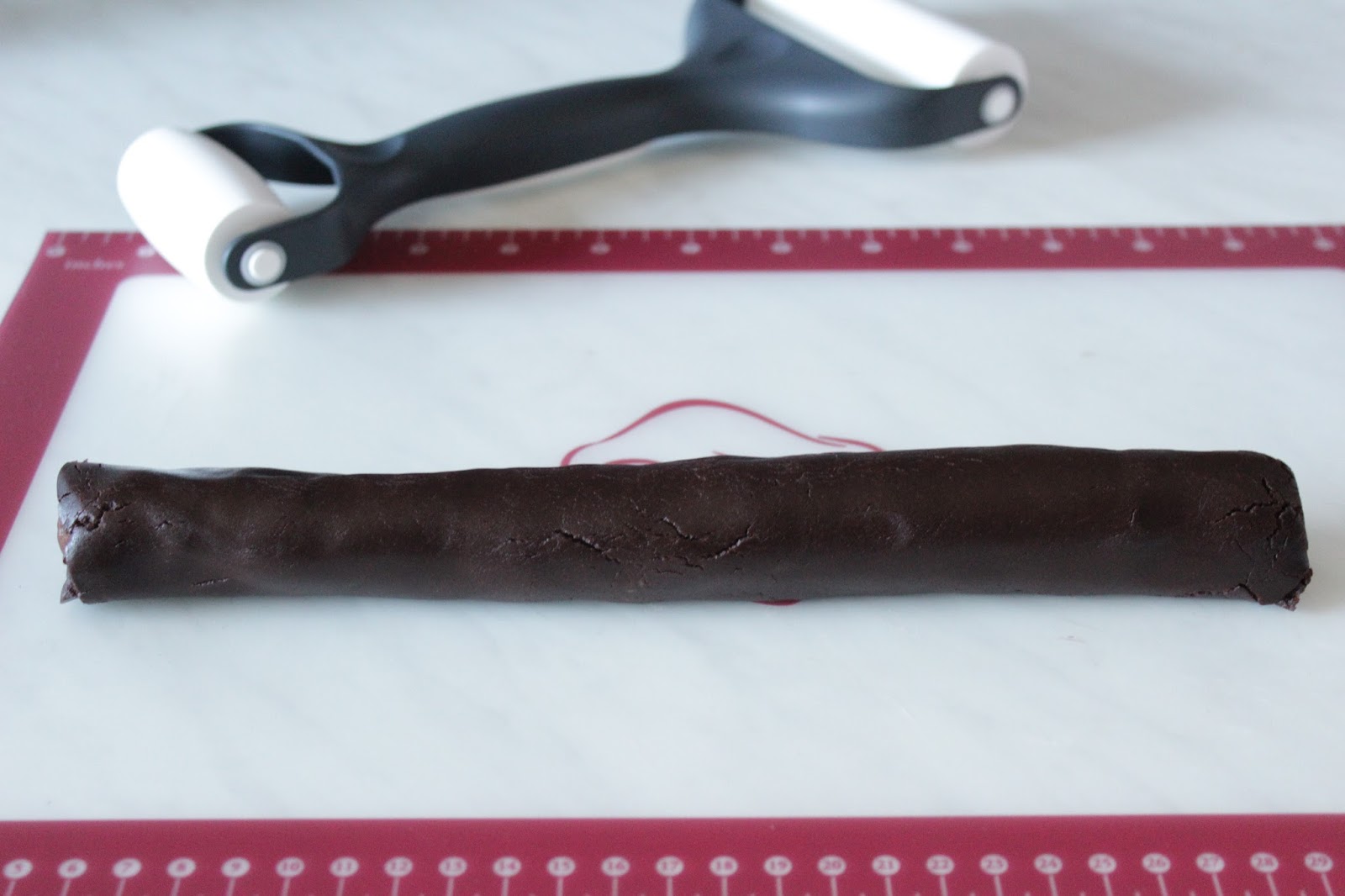 Nach der Kühlzeit den dunkelbraunen Teig zu einem Rechteck von ca. 12 x 25 cm ausrollen.