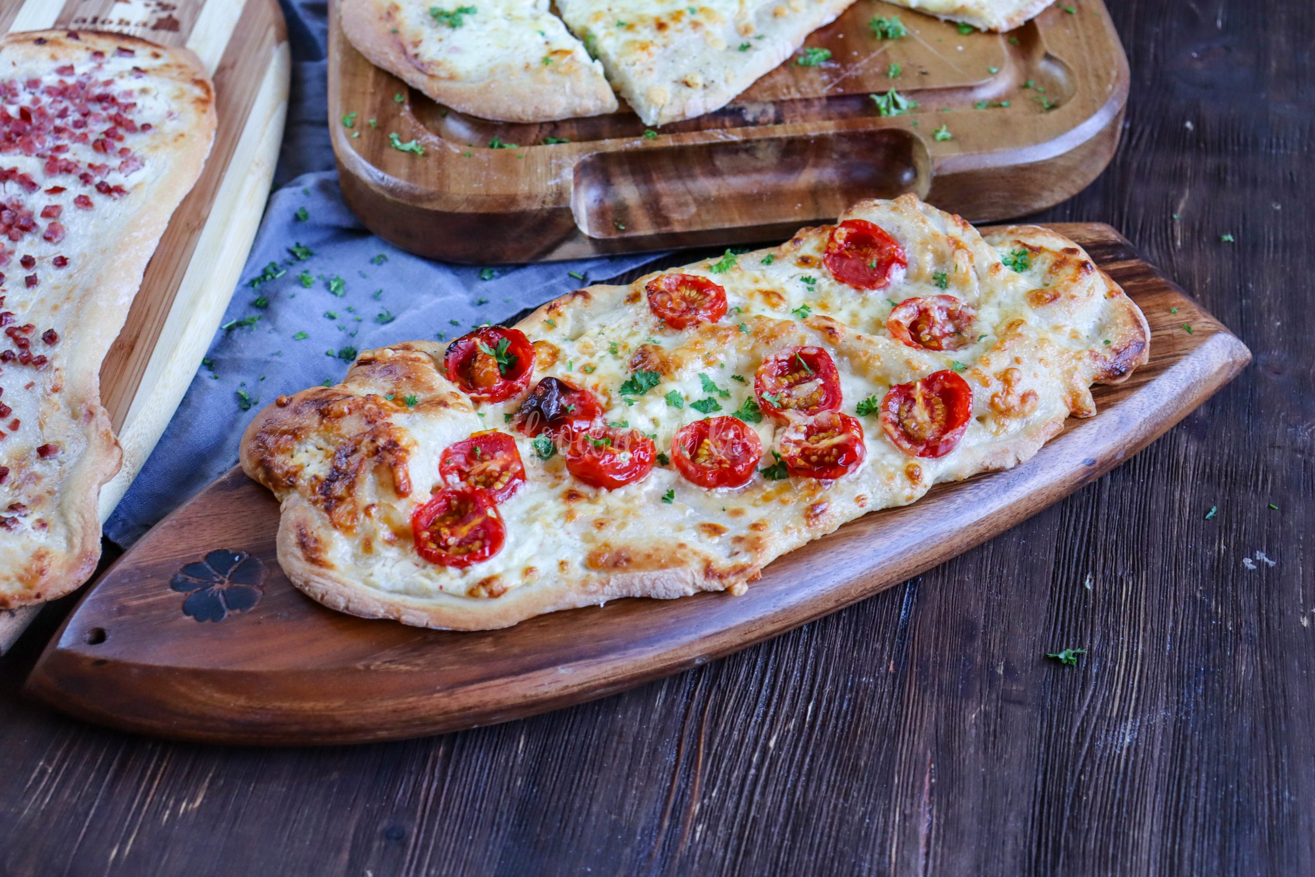 Knuspriger, gebräunter Teig dick mit einer Schmandcreme bestrichen und belegt nach Lust und Laune. Wie wäre es mit Speckwürfeln, Käse, Thunfisch oder Tomaten? Egal welche Variante, sie schmecken einfach ganz wunderbar.