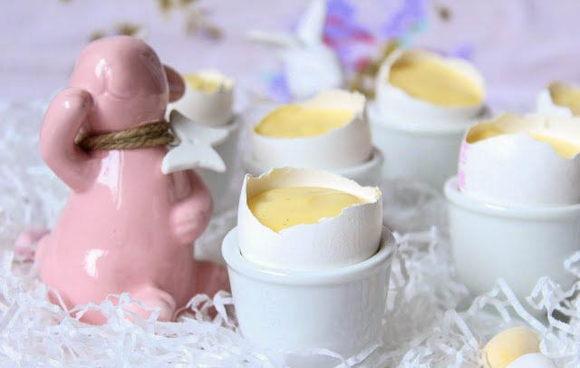 Es ist doch viel witziger und sieht auf eurem Ostertisch bezaubernd aus, wenn Ihr den Pudding in Eierschalen serviert.